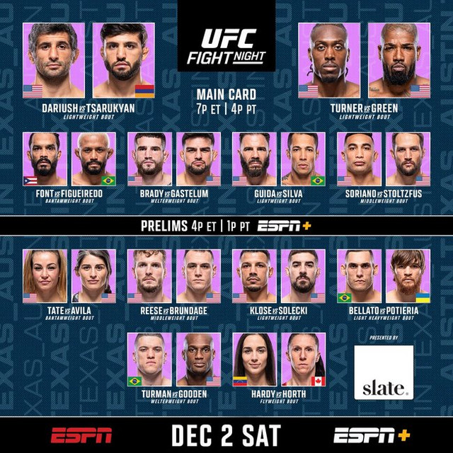 UFC on ESPN: Dariush vs. Tsarukyan (also known as UFC on ESPN 52) was a mixed martial arts event produced by the Ultimate Fighting Championship that took place on December 2, 2023, at the Moody Center in Austin, Texas, United States.